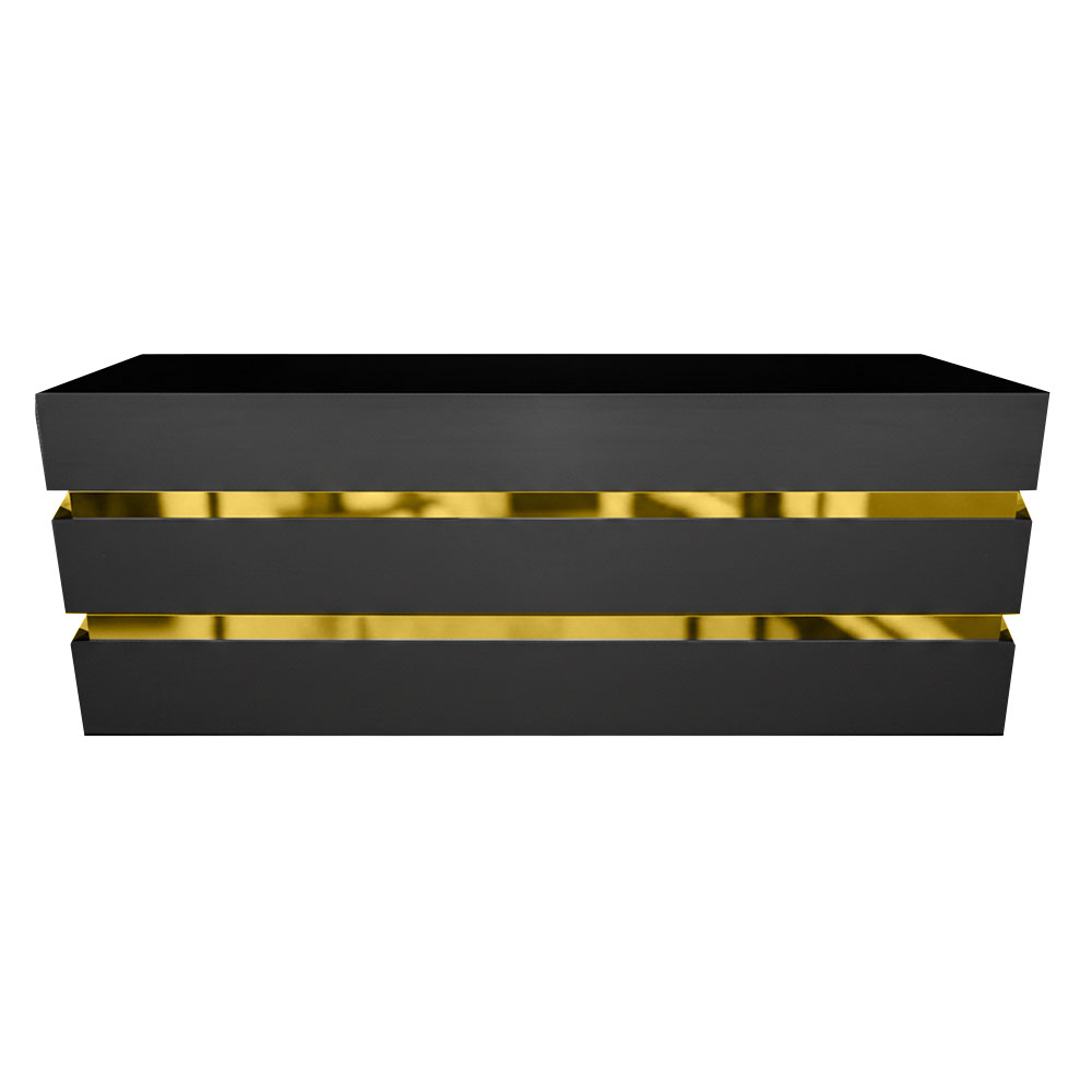 The Bellini Bar (pictured) is a gloss black painted wood bar with recessed front and side accent panels wrapped in reflective gold vinyl. It has no rear shelving. It can be branded for an additional charge.  Be sure to contact one of our specialists to ensure your graphics and logos will properly fit the areas you will need branded.